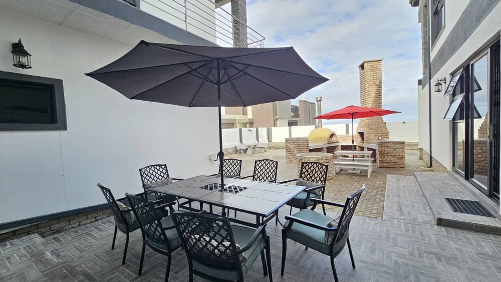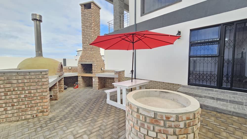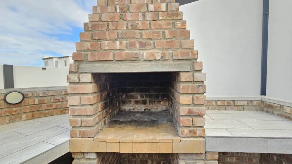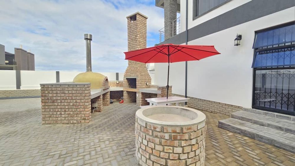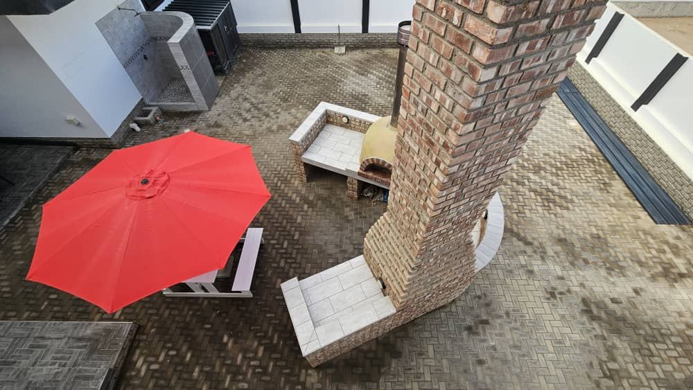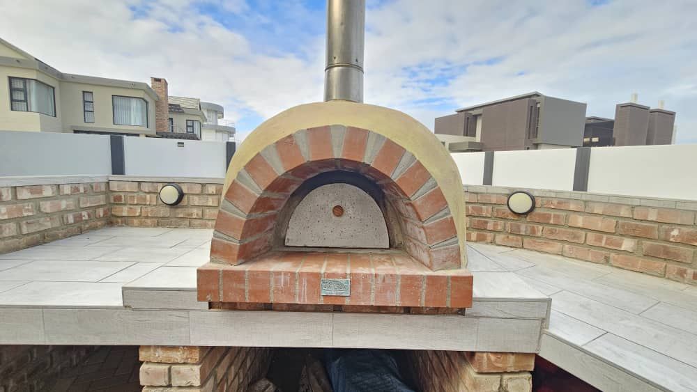 An outdoor entertainment area features a built-in BBQ and a pizza oven, perfect for hosting.
