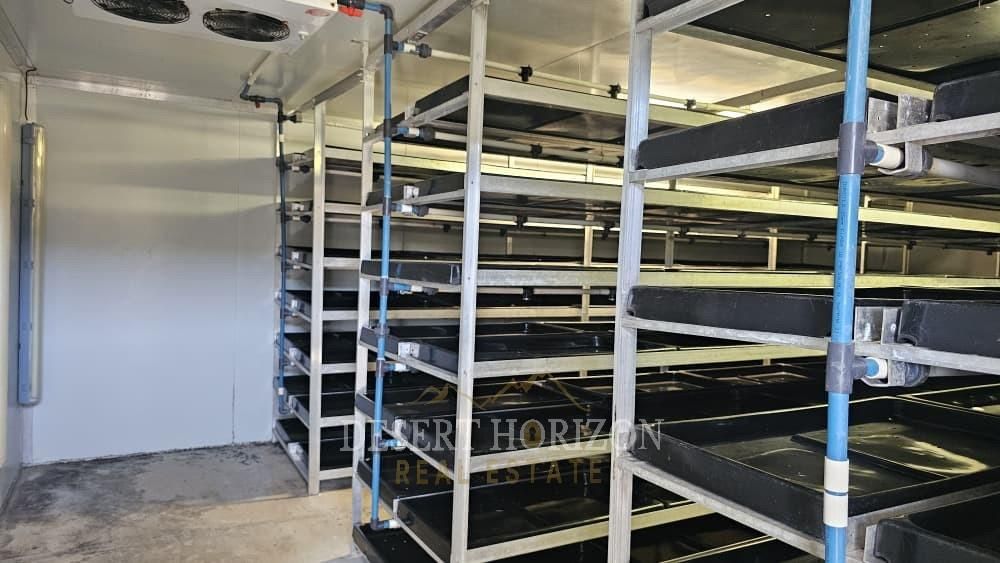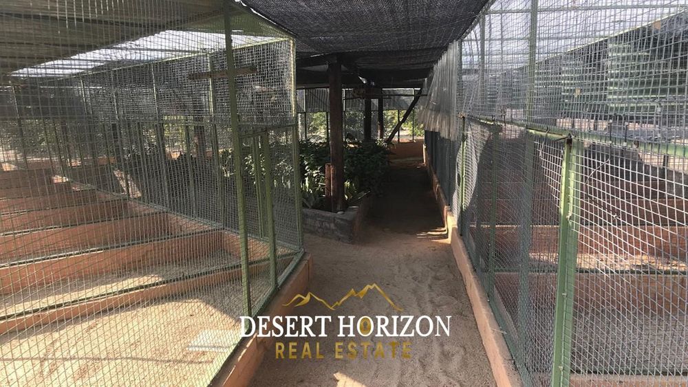 Infrastructure is top-notch, with permanent NAMPOWER/Erongo RED electrical connection, pressurized clean water systems for domestic use, and specialized facilities like a hydroponics feed grow facility and a large cold room for commercial meat processing. The property also features a 5-bedroom main house, a worker's housing complex, and various outbuildings including garages, workshops, and bird cages.