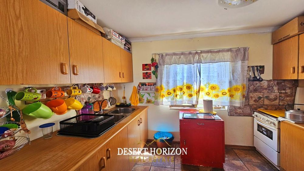 The main house boasts an inviting open-plan layout, seamlessly combining the living, dining, and kitchen areas into a harmonious space perfect for everyday living. Step outside to find an braai and entertainment area, offering a sheltered spot for hosting gatherings with family and friends. On warm days, cool off in the refreshing swimming pool, a delightful feature of this property.