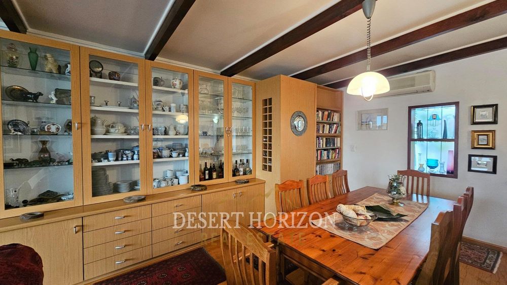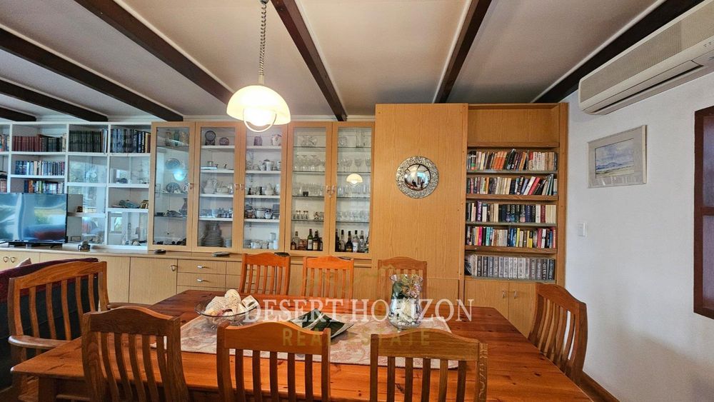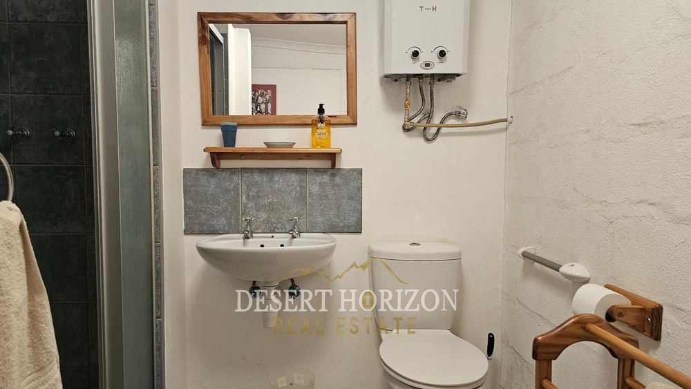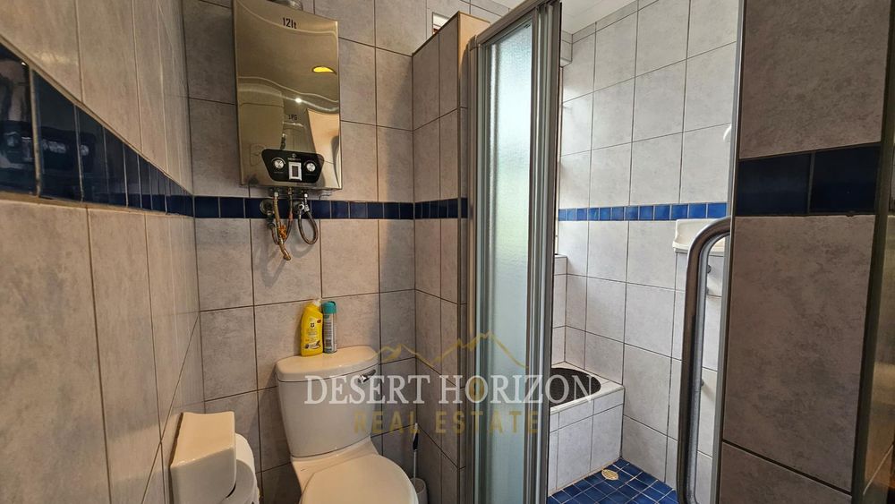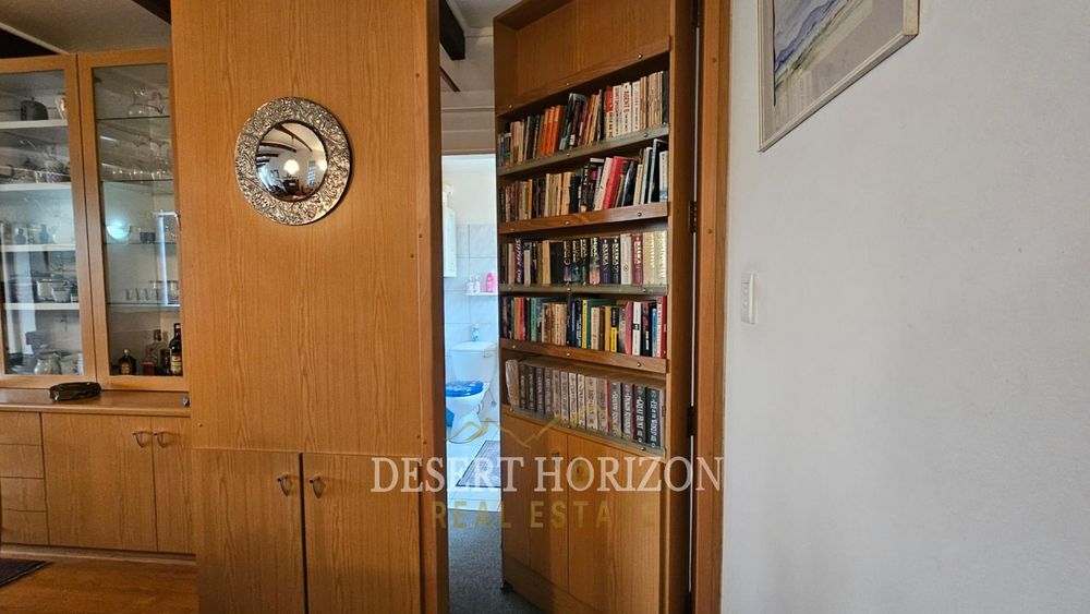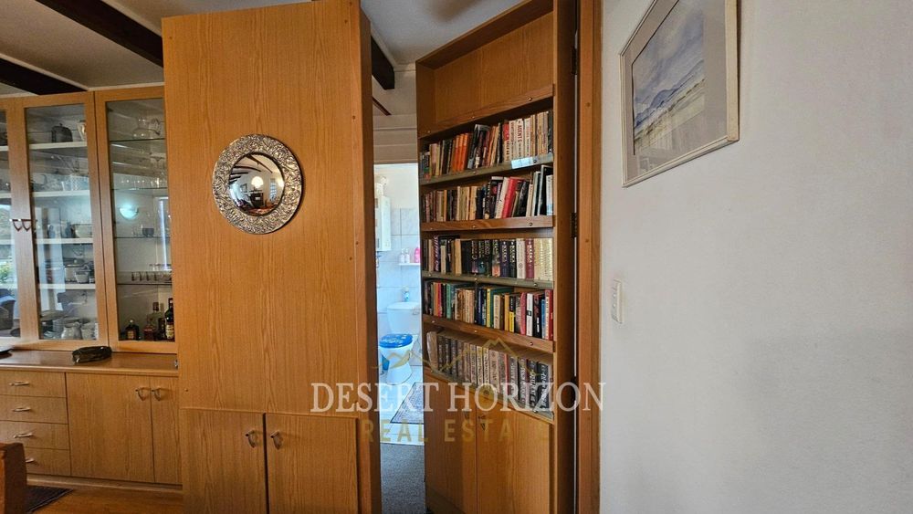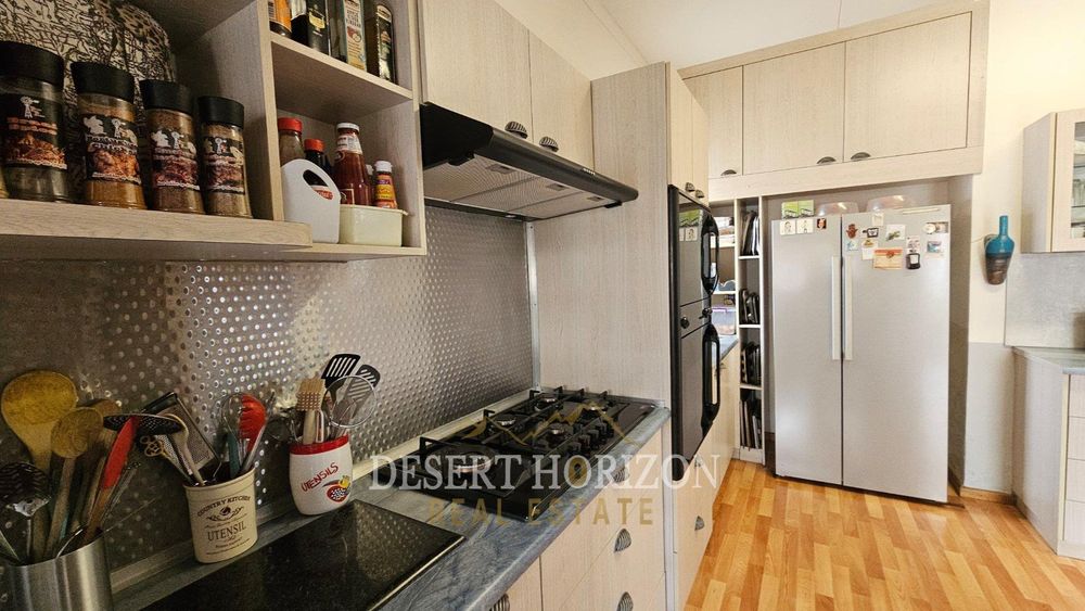 Upon entering, you are greeted by a beautiful room designed to warmly welcome guests. The spacious open-plan kitchen features a gas stove and electric oven, ideal for culinary enthusiasts. Adjacent to the kitchen is a delightful dining and TV area, complete with an air conditioning unit and a cleverly concealed bookshelf.