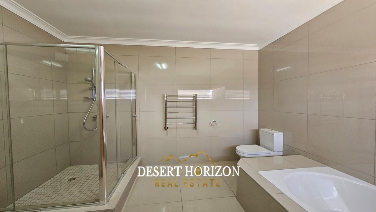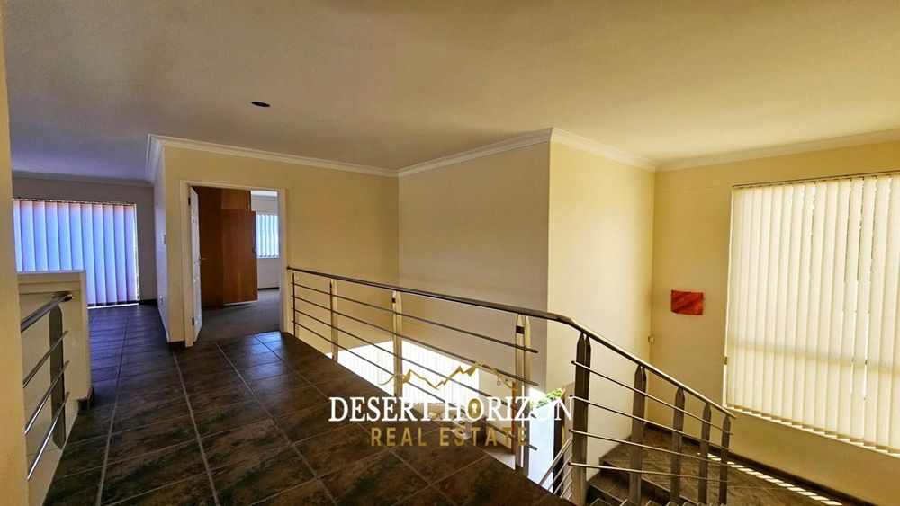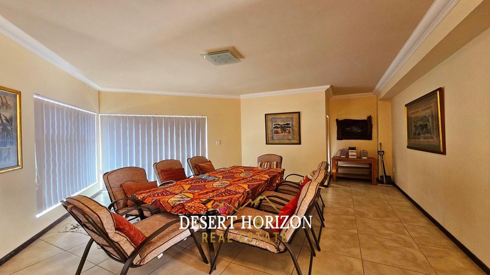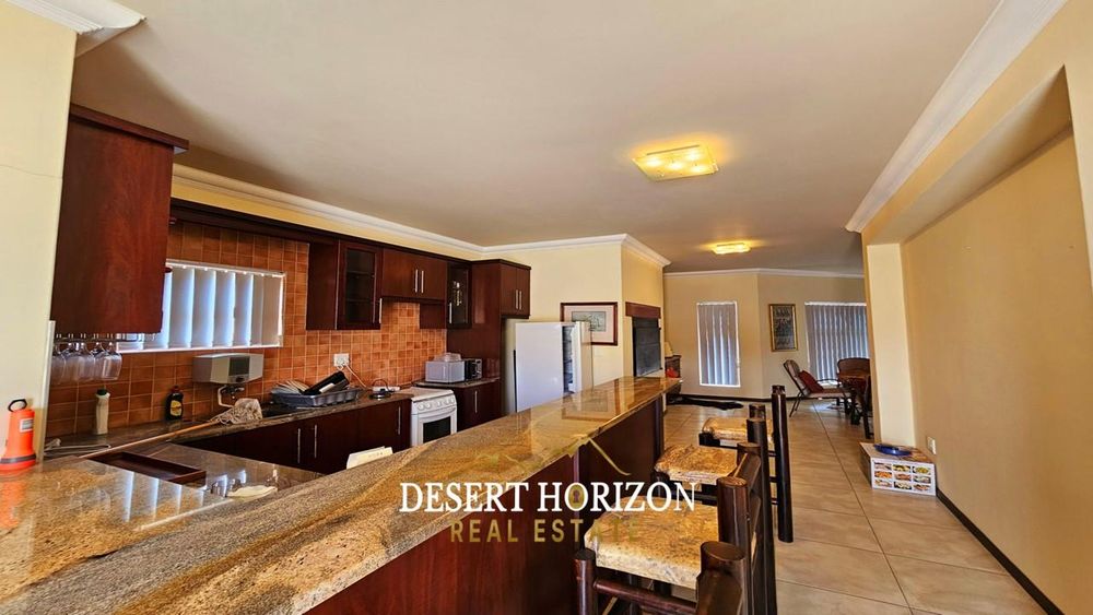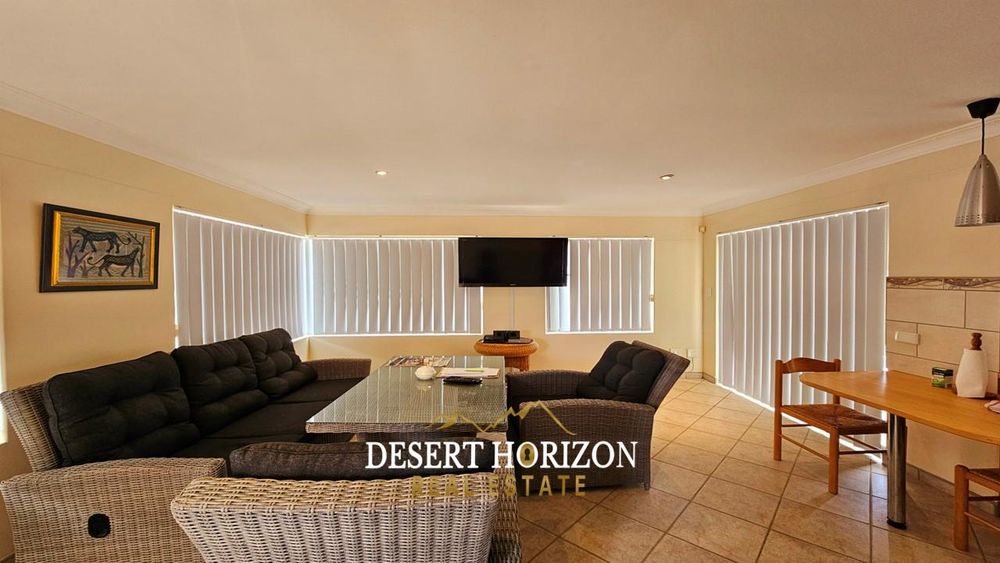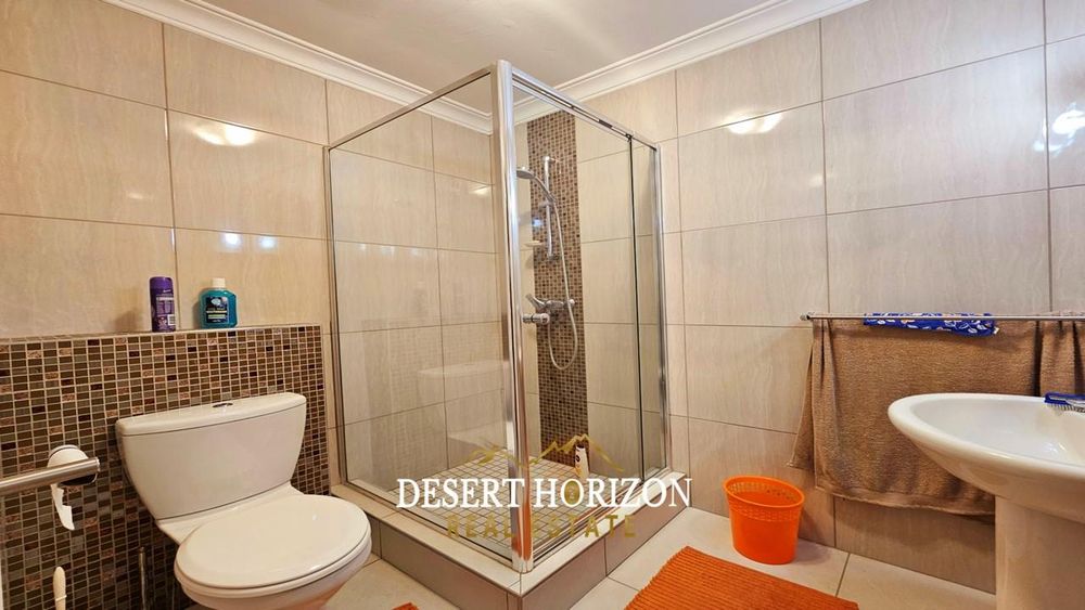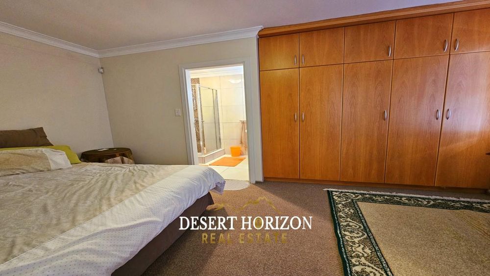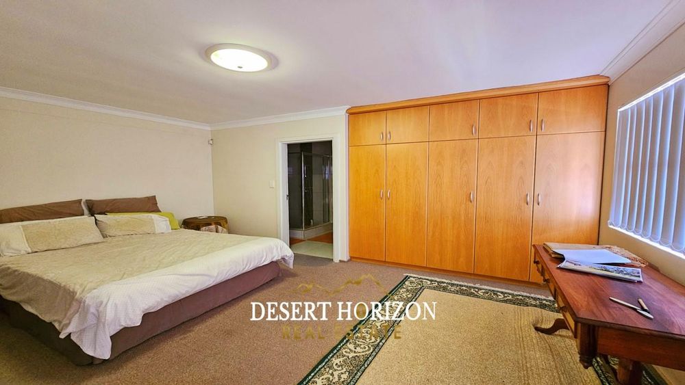 Upon entering, you are greeted by the main bedroom, featuring an ensuite bathroom and a dressing room equipped with built-in cupboards (BIC). The open plan kitchen is a culinary enthusiast’s delight, complete with a back kitchen and scullery, both also with BIC for your convenience. The adjoining dining room seamlessly flows into an entertainment area, complete with an indoor BBQ—perfect for hosting gatherings. The living room provides a cozy retreat, while a guest WC adds convenience. Step outside to a spacious yard, where a beautifully landscaped garden and panoramic sea views create an idyllic outdoor oasis.