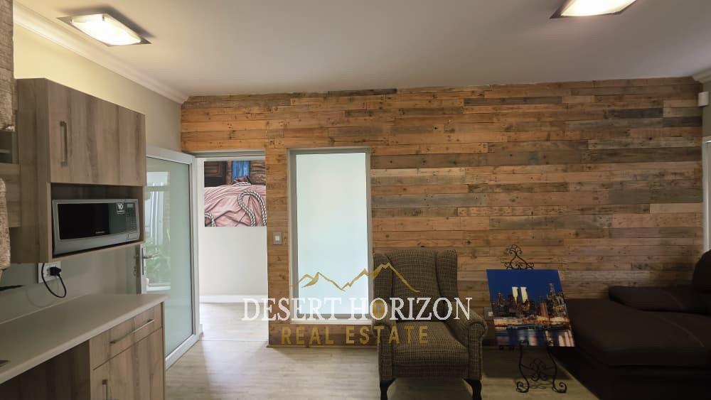 Covered patio featuring a sunken lounge area designed to offer wind protection, with ample space for outdoor relaxation and sun lounging, as well as an outdoor braai.