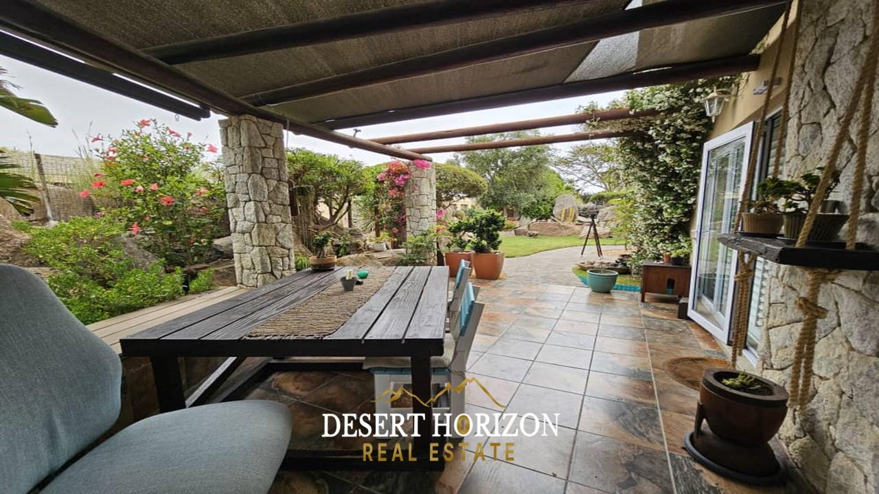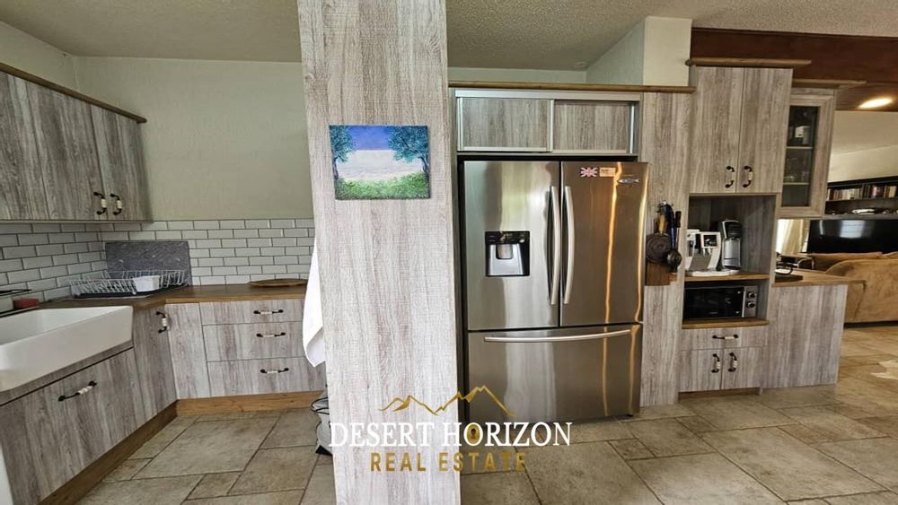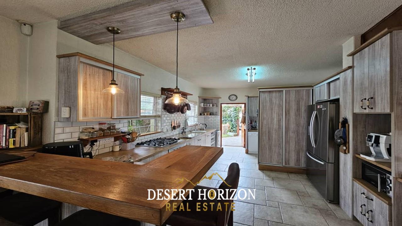 This home is designed for convenience with two garages and an additional open parking space. There's also a separate golf cart garage that doubles as a laundry area. The property includes a well-maintained garden with a sprinkler system that utilizes gray water, ensuring eco-friendly upkeep.